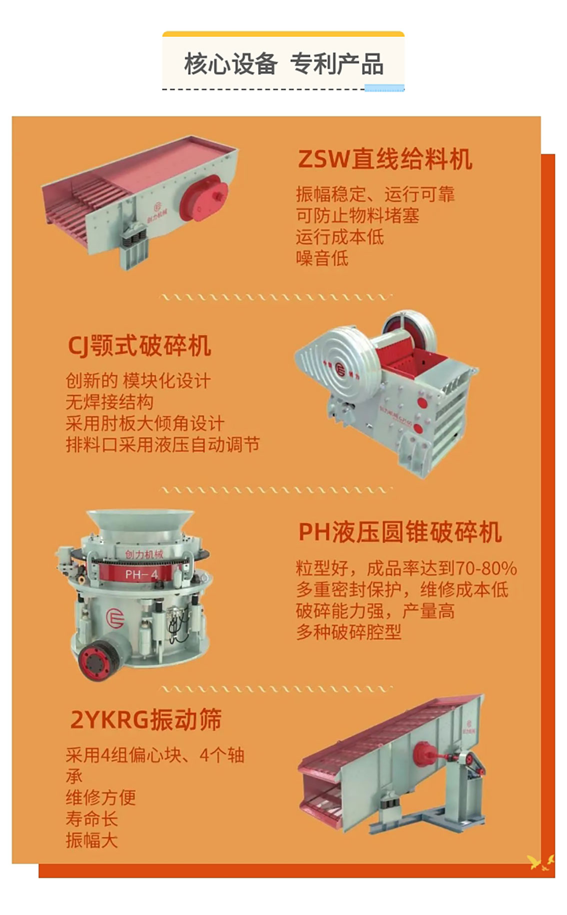 公司的主要產品PH系列多缸液壓高效圓錐機,是目前世界上最先進的、自動化程度最高的圓錐機。公司還生產與之配套的顎式破碎機、反擊式破碎機、給料機、振動篩等系列產品,同時單缸液壓圓錐機及高速顎式破碎機、旋回式破碎機、制砂機等已成功研發,為企業開拓了廣闊的市場前景。